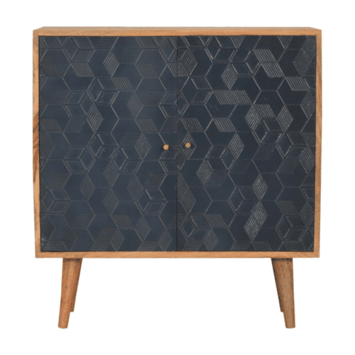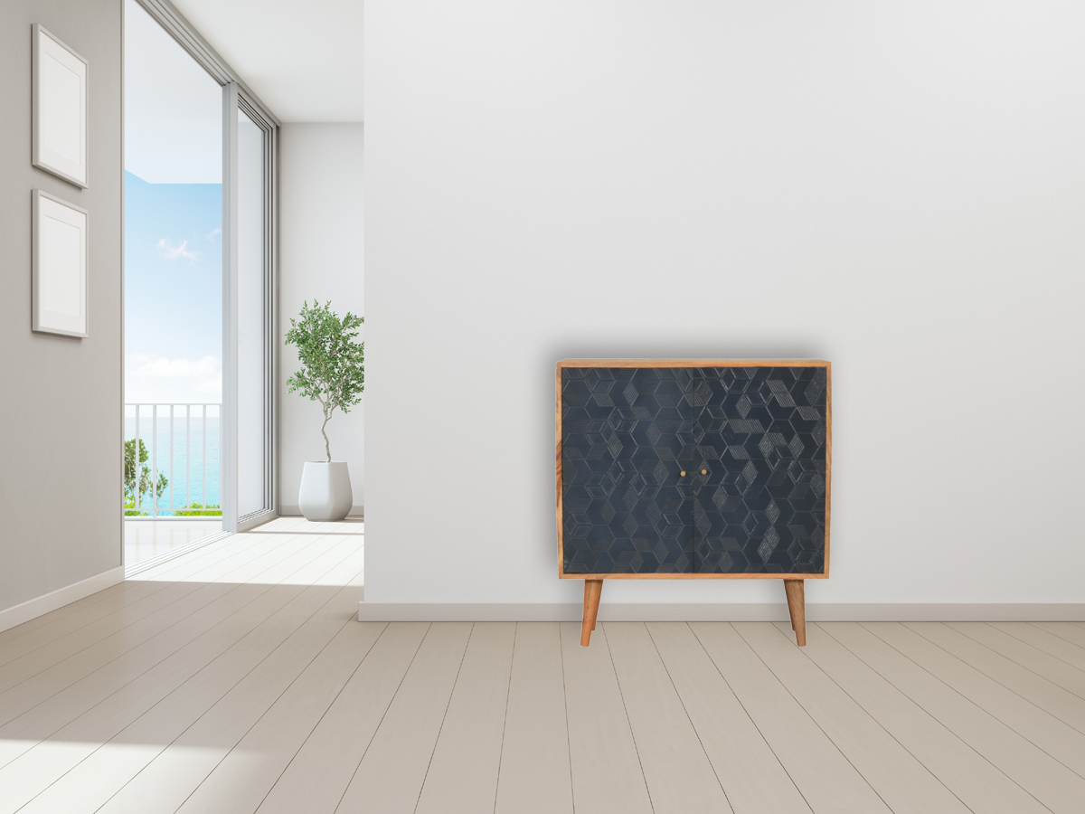 From the moment you set eyes on the Acadia Navy Cabinet, you’ll be struck by its bold, navy cube design. Artfully constructed from 100% solid mango wood, this chic piece serves as a testament to the time-honored tradition of skillful woodworking, while also embracing a fresh and modern aesthetic that sets the trend in contemporary home décor. The cabinet’s nordic style legs pay homage to minimalist Scandinavian design, offering a clean and graceful stance that complements its robust frame.