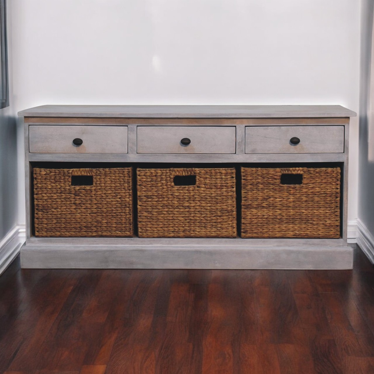 The cabinet offers versatile storage options with its combination of three sleek drawers and three handwoven wicker baskets. Each element is thoughtfully crafted to keep your living spaces clutter-free while adding a touch of rustic elegance. The drawers glide effortlessly, perfect for housing smaller items, while the baskets provide ample space for shoes, accessories, and other essentials, ensuring your home remains organized and stylish.