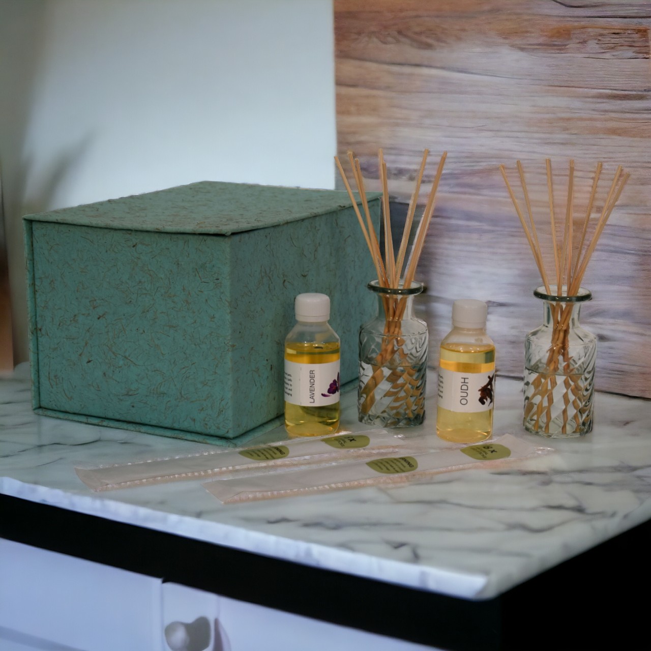 It is made from all-natural ingredients and scented with pure aromatherapy essential oils. It features 2 diamond cut glass reed diffusers, reed sticks, 2 X fragrant reed diffuser oil in Lavender & Oudh in a PET bottle. Simply pop the sticks into the diffuser and enjoy.