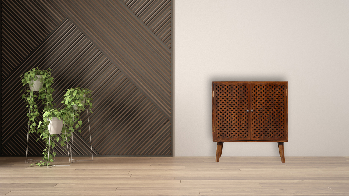 This stunning Arlo Cabinet has been constructed from 100% solid mango wood and has a smooth chestnut finish. The main feature of this piece is the carved cutout door fronts which gives this piece its individual retro character, not forgetting the shelves inside which offer plenty storage space. It also features a shiny brass knob and stands on 4 nordic style legs.