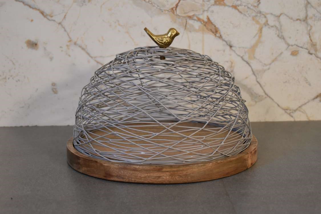 This cake stand is a beautiful decoration for your dining table or kitchen counter. It features a round wooden base and a blue netted top that has a brass finish bird handle allowing your entire space to feel fresh, on-trend, and refined. This product is handcrafted individually and as every piece is unique please do expect variations in finish, texture, size and should not be considered as a defect.