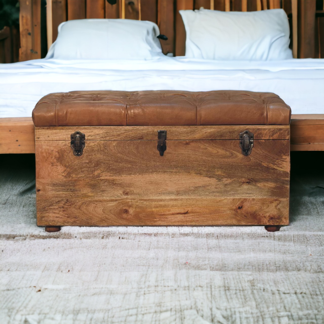 Beneath the lavish exterior, the real treasure lies hidden. A spacious compartment provides an ideal solution to keep your living space clutter-free. Discreet storage allows for an assortment of household items to be neatly tucked away—out of sight but always within reach. Living rooms, hallways, and bedrooms will all benefit from this trunk’s dual-purpose design, providing seating and storage in a single, elegant furniture piece.