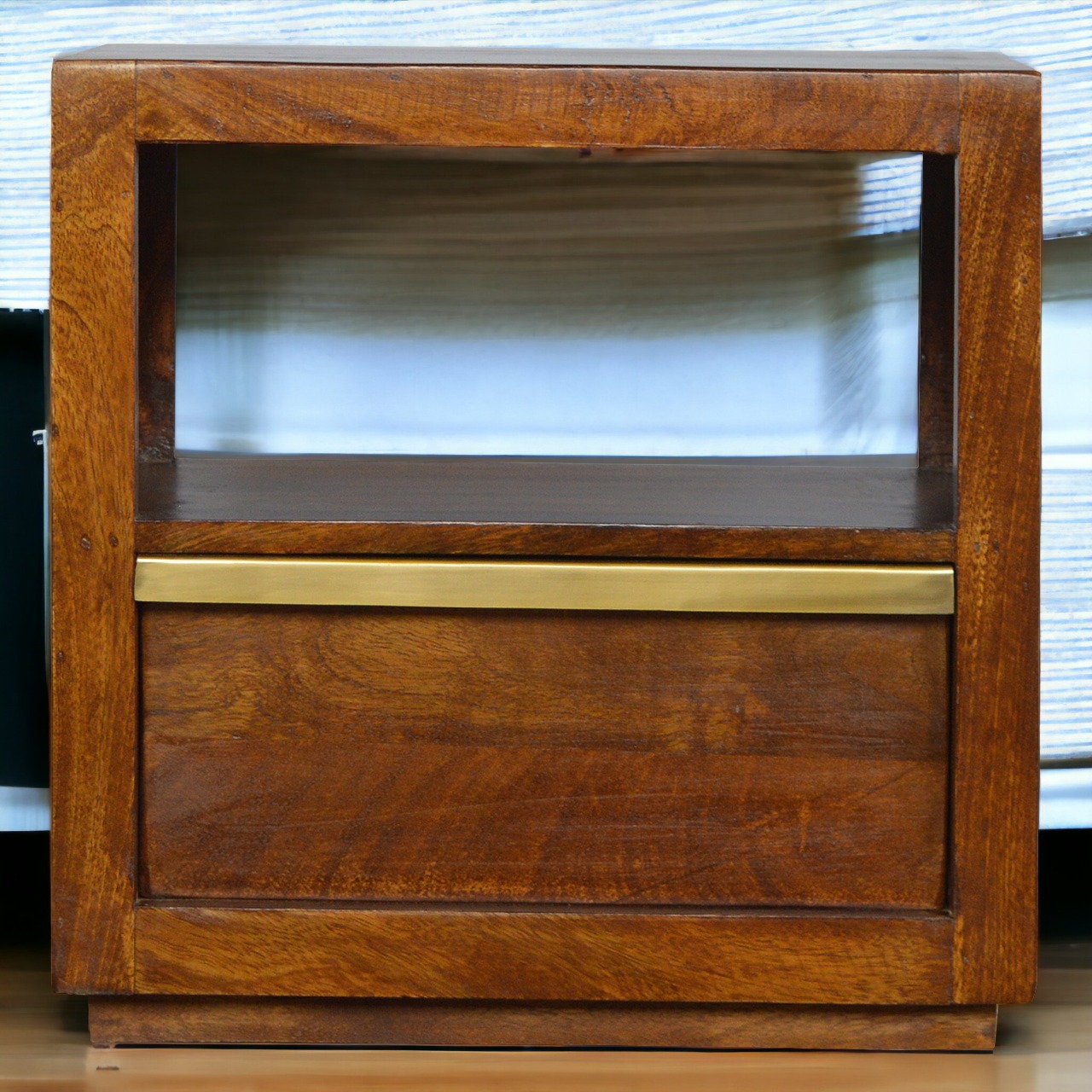 Introducing the Gold Bar Chestnut Bedside Table—a harmonious blend of contemporary design and timeless craftsmanship. This exquisite piece of furniture is destined to enhance your bedroom with its impeccable form and function. Crafted from 100% solid mango wood and adorned with a sophisticated chestnut finish, this bedside table is a true testament to quality, durability, and style.
