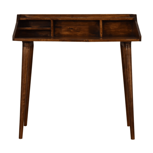 Expertly hewn from 100% solid mango wood and adorned with a refined chestnut finish, this writing desk stands as a hallmark of quality and durability. Its four different sized compartments are thoughtfully crafted to house your papers and small accessories, ensuring a clutter-free workspace. The raised back feature combines ergonomics with elegance, creating an inviting nook for work or study. The desk’s four Scandinavian styled legs not only provide stable support but also add a touch of minimalist charm that complements any room setup.