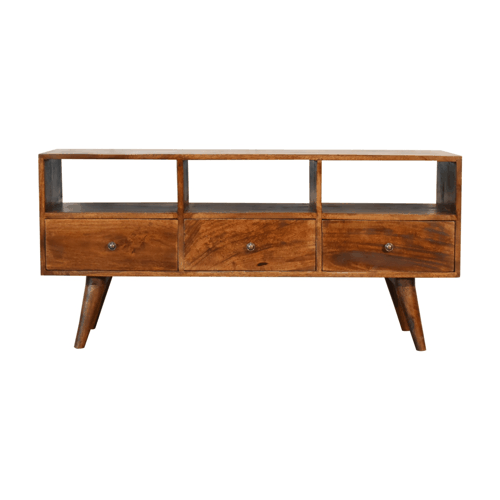 Crafted following age-old traditions, the Chestnut Nordic 3 Drawer TV Unit shows off the exceptional craftsmanship of artisans who work with their hands to transform raw materials into stunning pieces of furniture. Each element reflects the meticulous attention to detail and the dedication of the craftsmen, making it not just a purposive furnishing but also a tribute to the rich lineage of woodworking. Its handmade nature guarantees that every unit has its unique signature, merging functionality with the personal touch of the artisan.