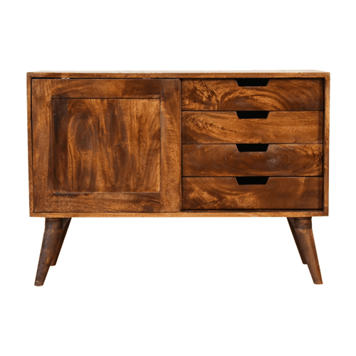 The Chestnut Sliding Cabinet not only stands out for its striking aesthetics and sturdiness but also for its commitment to sustainability. Carved from mango wood, a highly renewable and eco-friendly resource, it mirrors the ethos of sustainable living. Its construction process emphasizes minimal ecological footprint, showcasing how elegant furniture can also be a friend to our planet. By choosing this cabinet, you align with values that prioritize the protection and replenishment of our environment while enjoying a product that is designed to last for years to come.