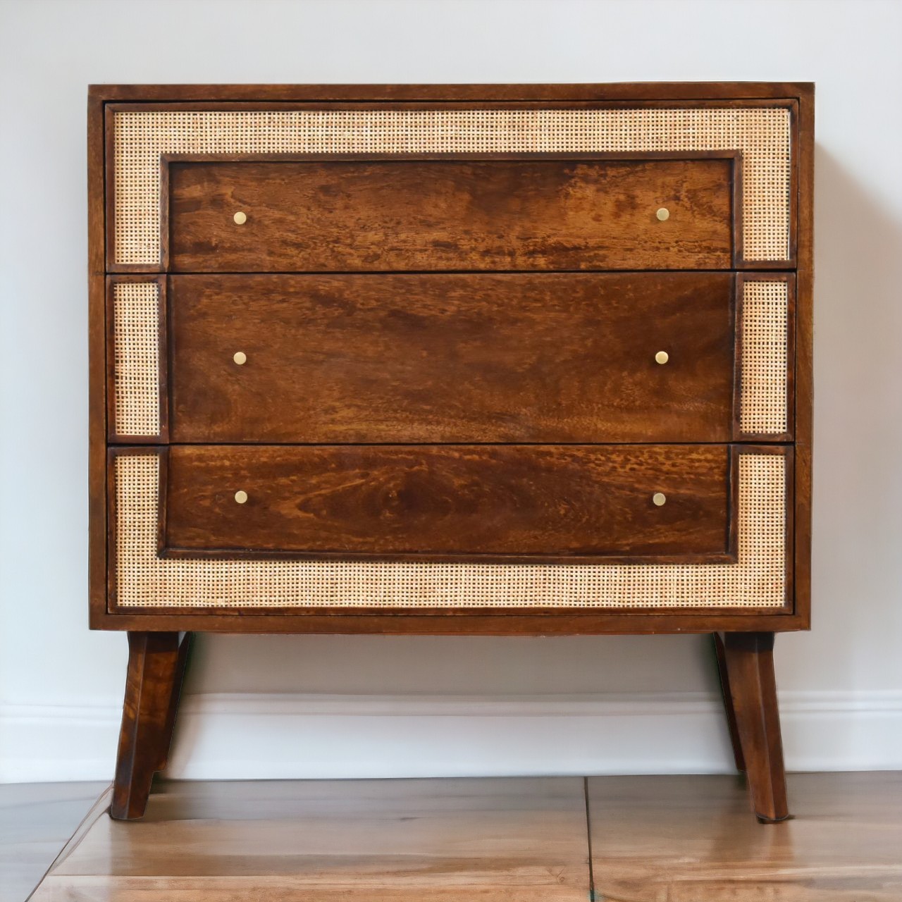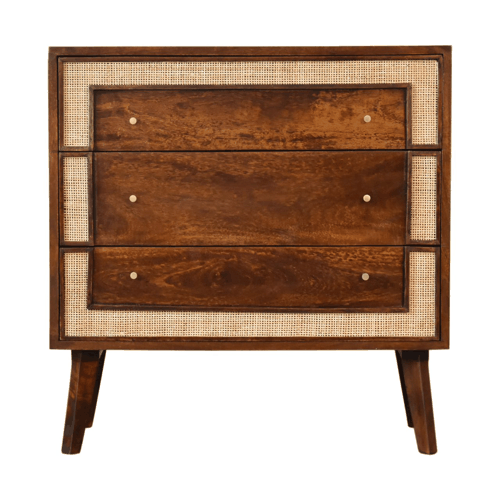 Characterized by smooth chestnut drawers and sturdy legs, the Close-knit Chestnut Chest maintains a harmonious balance of textures with its light woven design bordering the drawers, creating a beautiful visual contrast. This thoughtful mix of elements not only adds dimension but also introduces a touch of rustic charm, ensuring compatibility with various décor styles—be it traditional, modern, or eclectic.