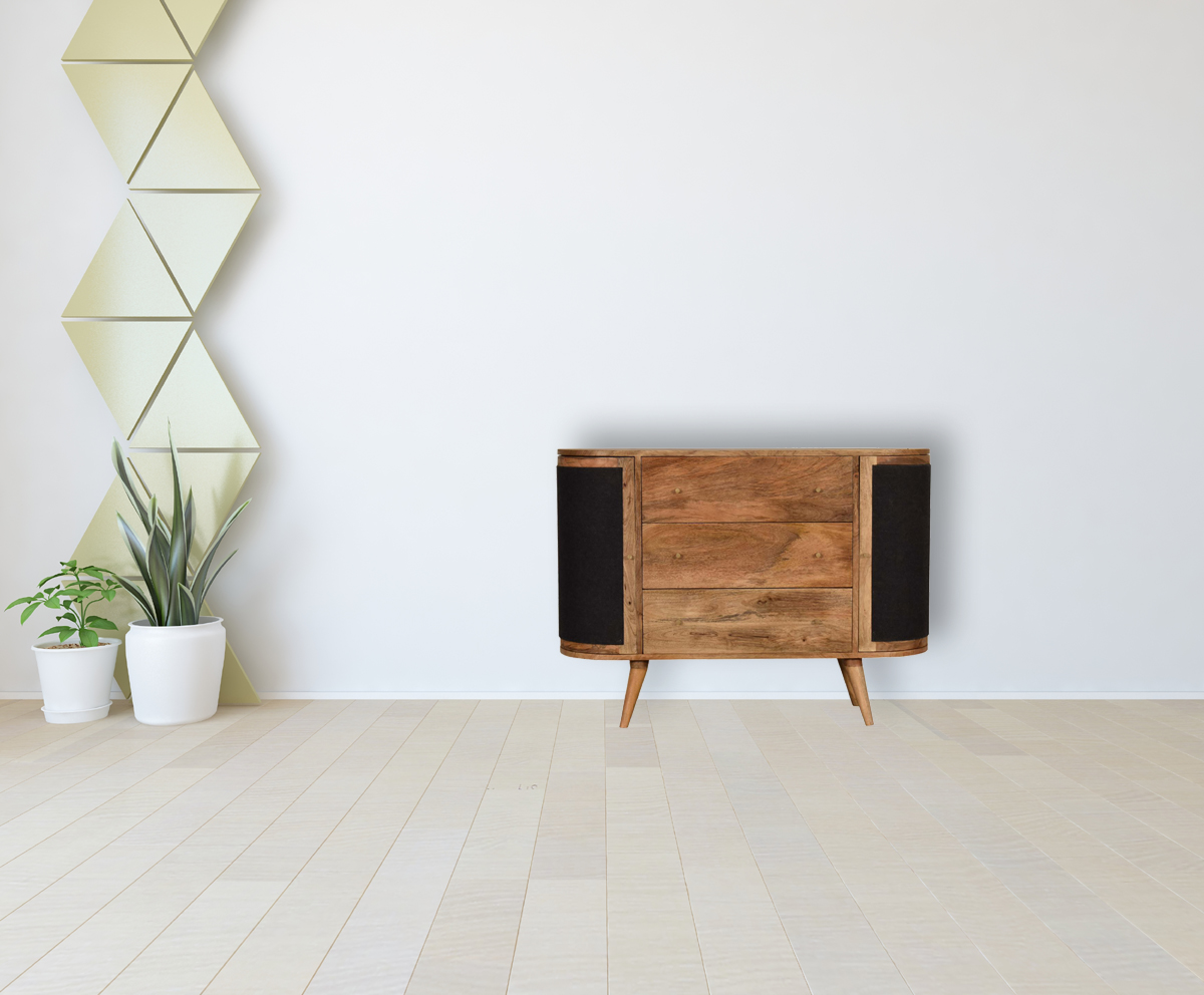This stylish cabinet combines a 2 black woven-style door fronts with a smooth oak-ish finish body and legs. Constructed from 100% solid mango legs it features 3 spacious drwers perfect for storage, shiny brass knobs on the drawers and nordic style legs. Make full use of this cabinet in the living room and partner it with the rest of the collection.