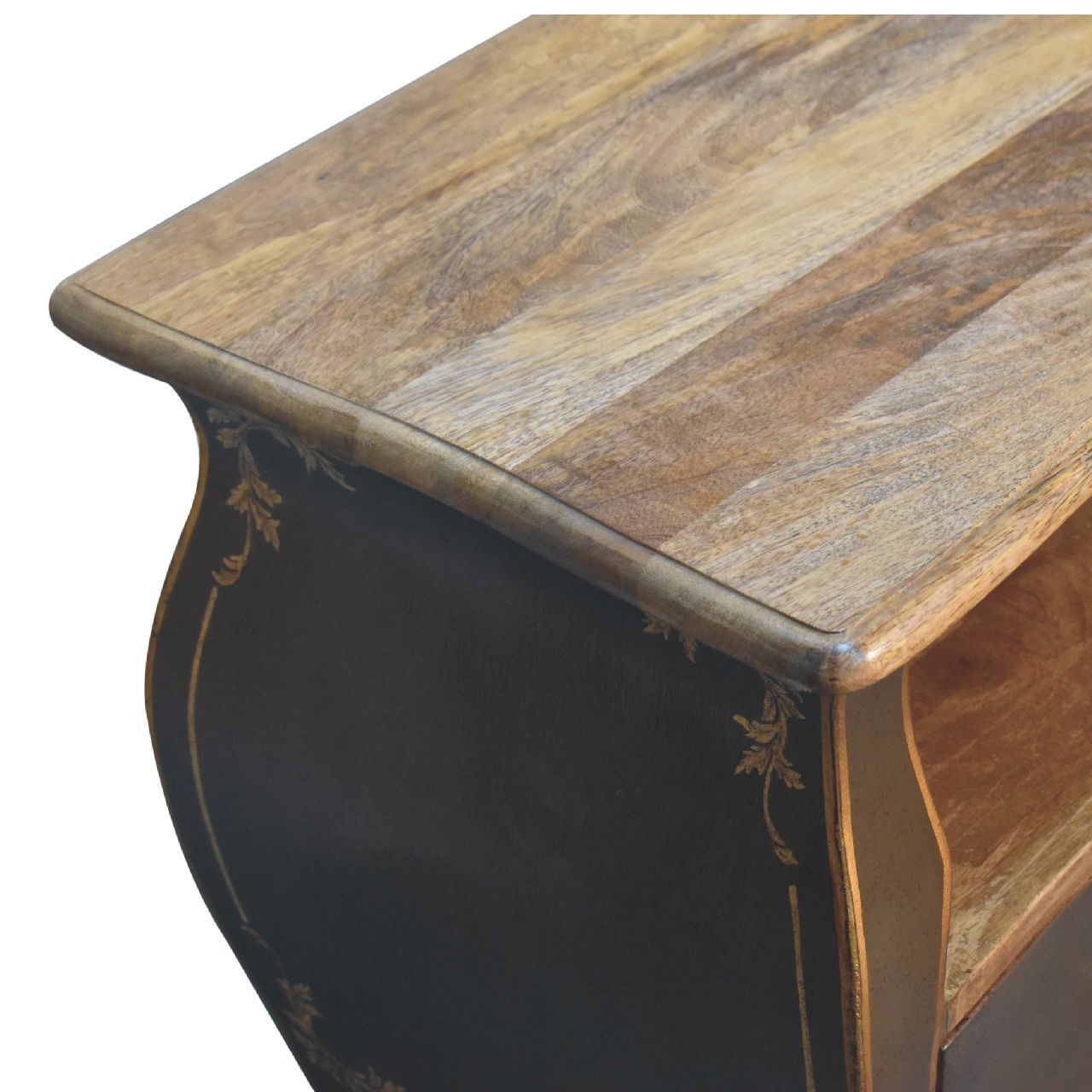 The natural top and inside of the drawers provide a beautiful contrast to the painted exterior, showcasing the wood’s natural beauty. The hand-painted sketched crown crest design nods to regal elegance, making this piece functional yet artistic. The sophisticated Chantilly legs, reminiscent of classic French furniture design, add a touch of historic charm, while the shiny brass knobs provide a luxurious finish.