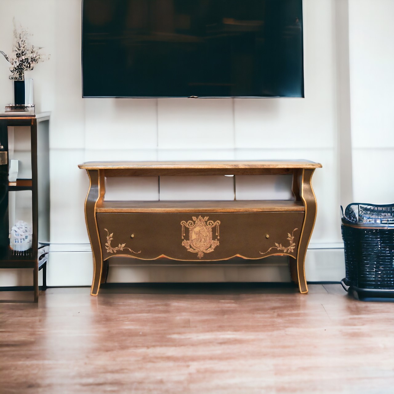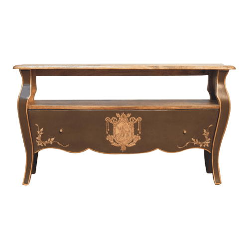The hand-painted sketched crown crest design on the front panel adds a touch of regal elegance, while the sophisticated Chantilly legs enhance its royal charm. This blend of historical allure and modern elegance makes the Coroner Media Unit perfect for those who cherish a combination of style, durability, and historical charm in their home decor.