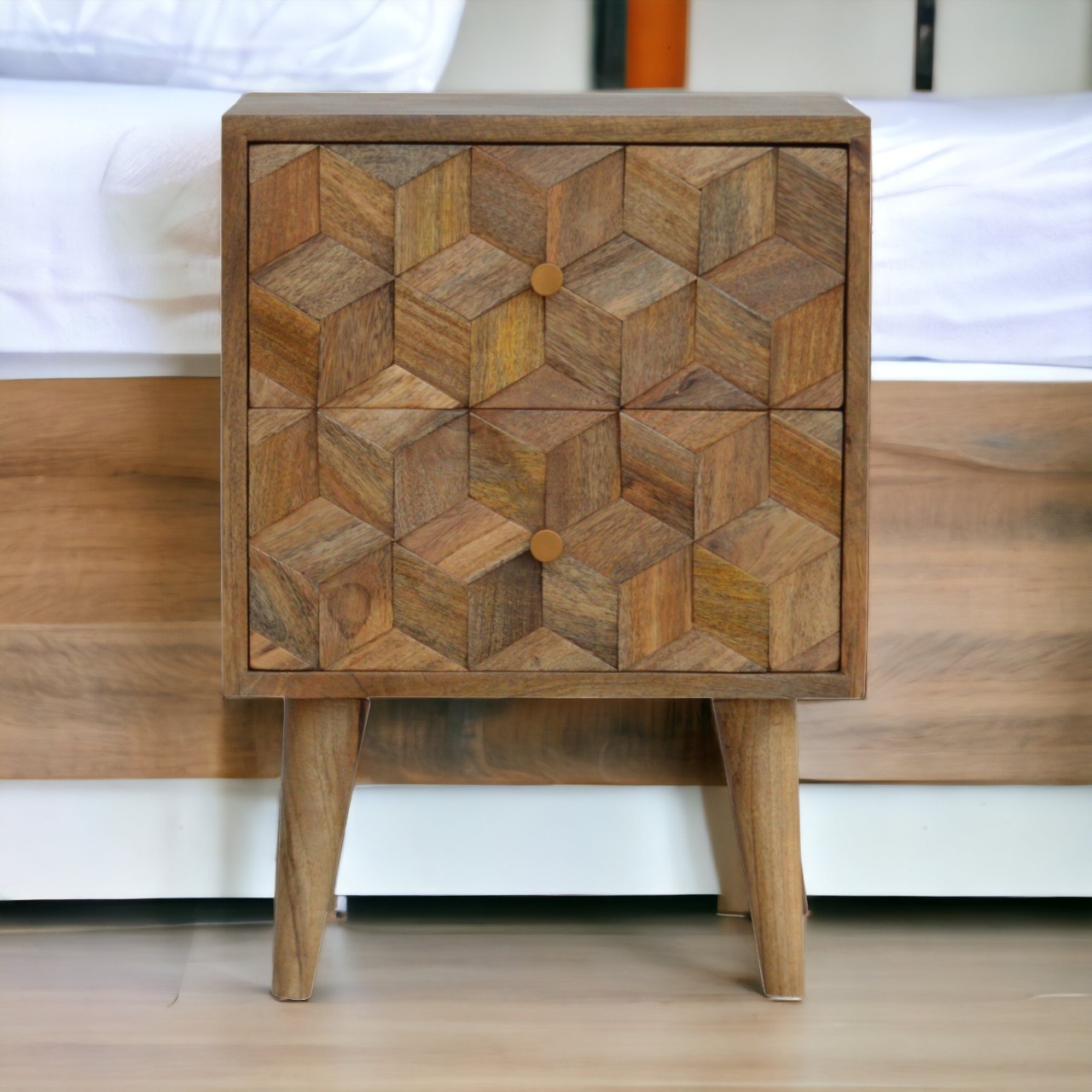 The carved cube design is the standout feature of this bedside table. Each drawer front is meticulously hand-carved, creating a geometric pattern that adds depth and texture to the piece. This intricate design not only showcases the skill and artistry involved in its creation but also adds a unique visual interest that sets this bedside table apart from ordinary furniture. The two spacious drawers provide ample storage for your bedside essentials, keeping your space organized and clutter-free.
