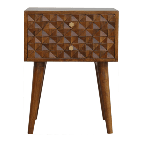 The main feature of this bedside are the carved diamond drawer fronts which make the pieces from this collection stand out. It has been constructed from 100% solid mango wood in a chestnut finish and stands on 4 Nordic style legs. It can be partnered with the other pieces from the range or stand individually as its style is versatile and can fit into different types of interiors.