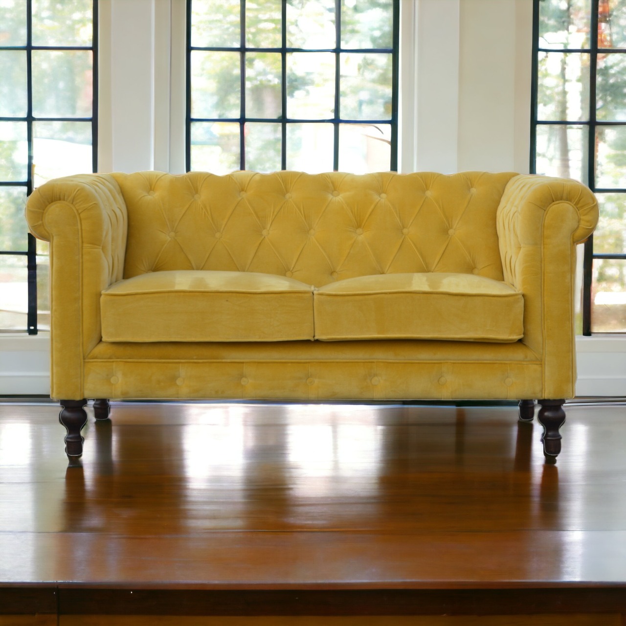 Immerse yourself in the luxurious comfort and bold style of the Mustard Velvet Chesterfield Sofa – a piece that stands as much a harbinger of classic elegance as it does a modern-day style icon. Adorned in rich mustard yellow cotton velvet, this two-seater sofa transforms any room into a vibrant sanctuary of comfort and sophistication. With its attention-commanding color and the regal charm of the Chesterfield design, this sofa is more than just a place to sit; it’s a centerpiece that invites conversation and admires glances.