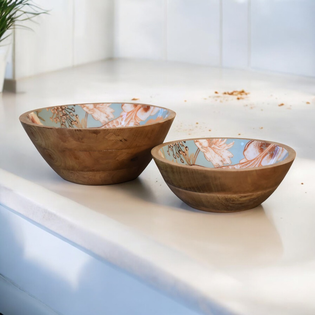 The Floral Bird Bowl Set of 2 is a stunning blend of elegance and craftsmanship. Made from 100% solid Mango Wood, each bowl is handcrafted with care. The unique floral designs add a touch of nature’s beauty, while the oak-ish finish offers a warm, rustic charm. Perfect for serving or displaying, this set brings a refined, yet organic touch to your home, elevating any dining experience with its timeless appeal and durable construction.