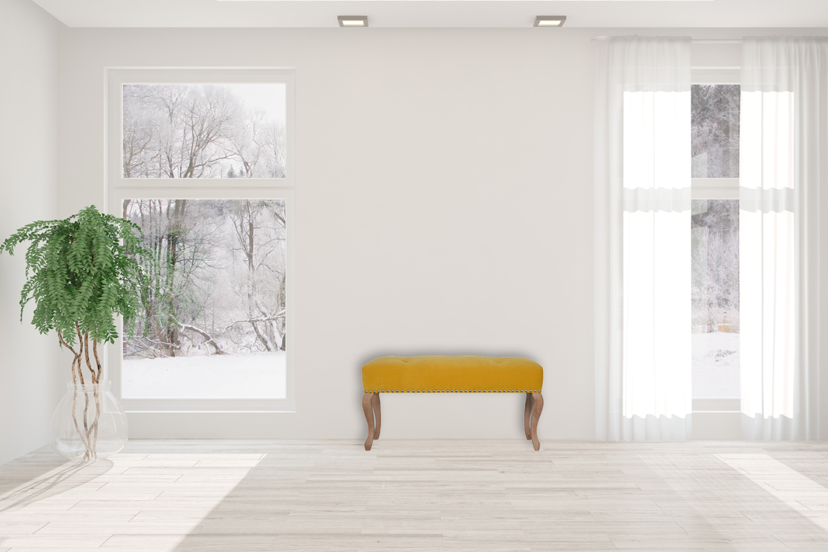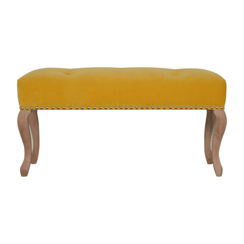 This elegant bench has been upholstered in a mustard cotton velvet fabric. It features carved French style legs constructed from 100% solid mango wood providing strength and durability along with a deep button and studded design. This simple yet classy piece can be incorporated in different home settings and interiors.