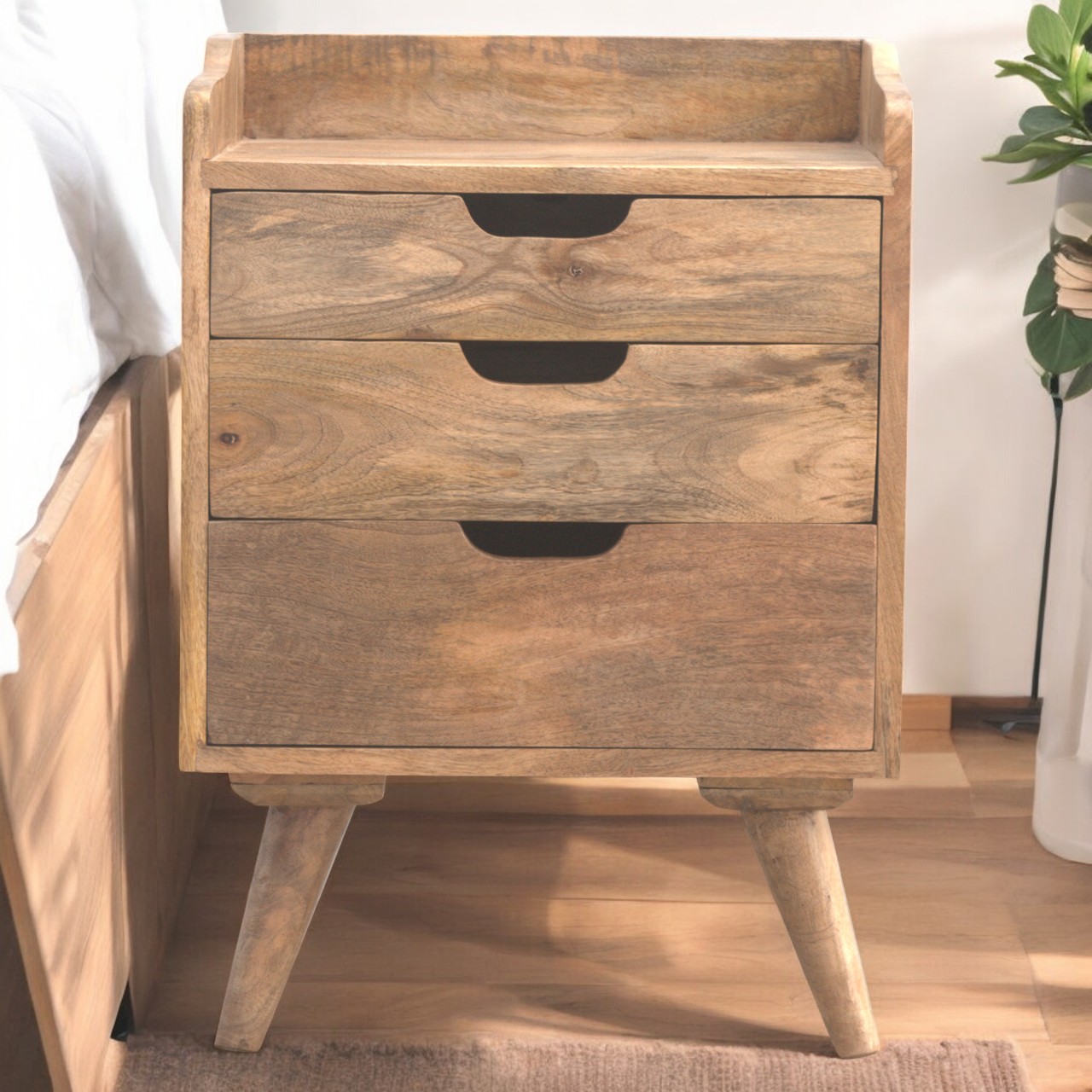 The 3 Drawer Gallery Bedside Table is a masterclass in design and functionality. Crafted from 100% solid mango wood, it boasts exceptional durability and a rich, natural oak finish that beautifully highlights the unique grain pattern of the wood. The construction of this piece not only ensures longevity but also brings the warmth and organic beauty of nature indoors, creating a serene and inviting atmosphere in your bedroom.