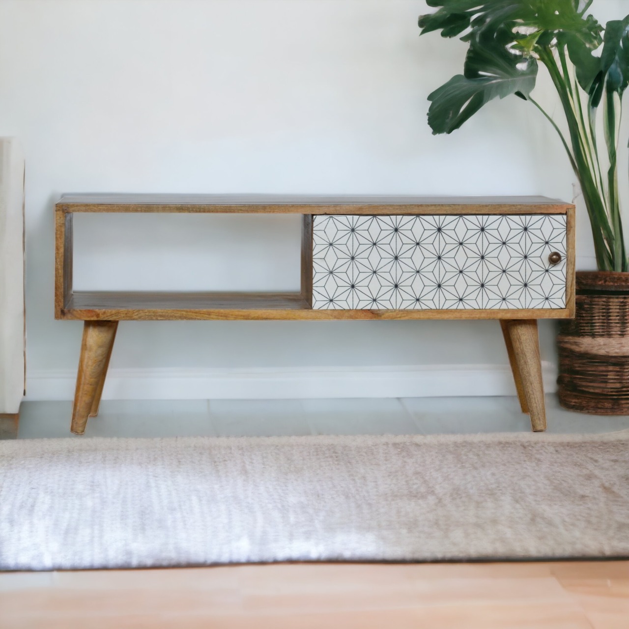 One of the standout features of this media unit is the geometric screen-printed door front. This intricate design infuses an extra dimension and character into the piece, transforming it from mere furniture to a work of art. The striking contrast between the smooth wooden surface and the bold patterns creates visual interest and captures attention, making it a focal point in your living area.