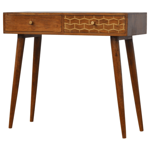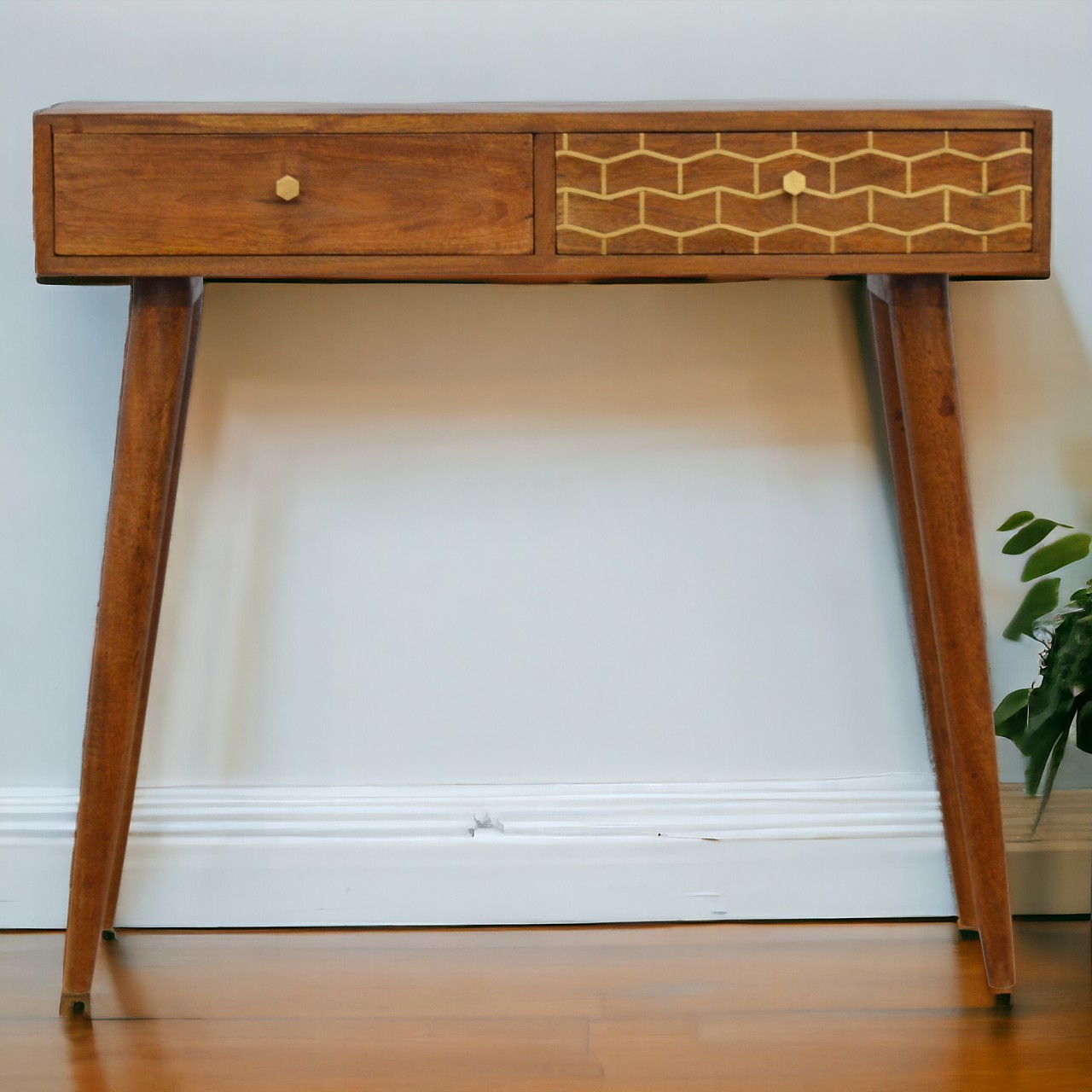 The Gold Art Pattern Console Table is an ode to the timeless beauty of solid wood construction, sourced from the ever-reliable mango tree. With a robust structure entirely handcrafted, this writing desk does not compromise in quality or aesthetics. It brings forward the innate warmth and captivating texture of wood, finished in a rich chestnut hue that adds depth and character to any room it graces.