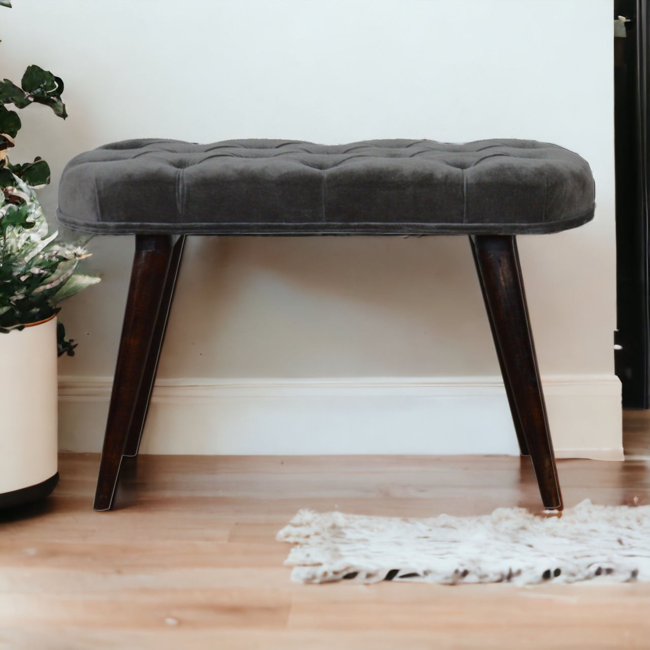 Introducing the Grey Velvet Gold Base Footstool, a Nordic-style bench that effortlessly blends modern elegance with classic design. This exquisite piece of furniture, upholstered in beautiful grey cotton velvet fabric, features a refined deep-button design that adds a touch of class to any room. Standing on four sturdy legs constructed from 100% solid mango wood with a warm walnut finish, this footstool is the perfect addition to your bedroom or hallway, adding a finishing touch to your home’s décor.