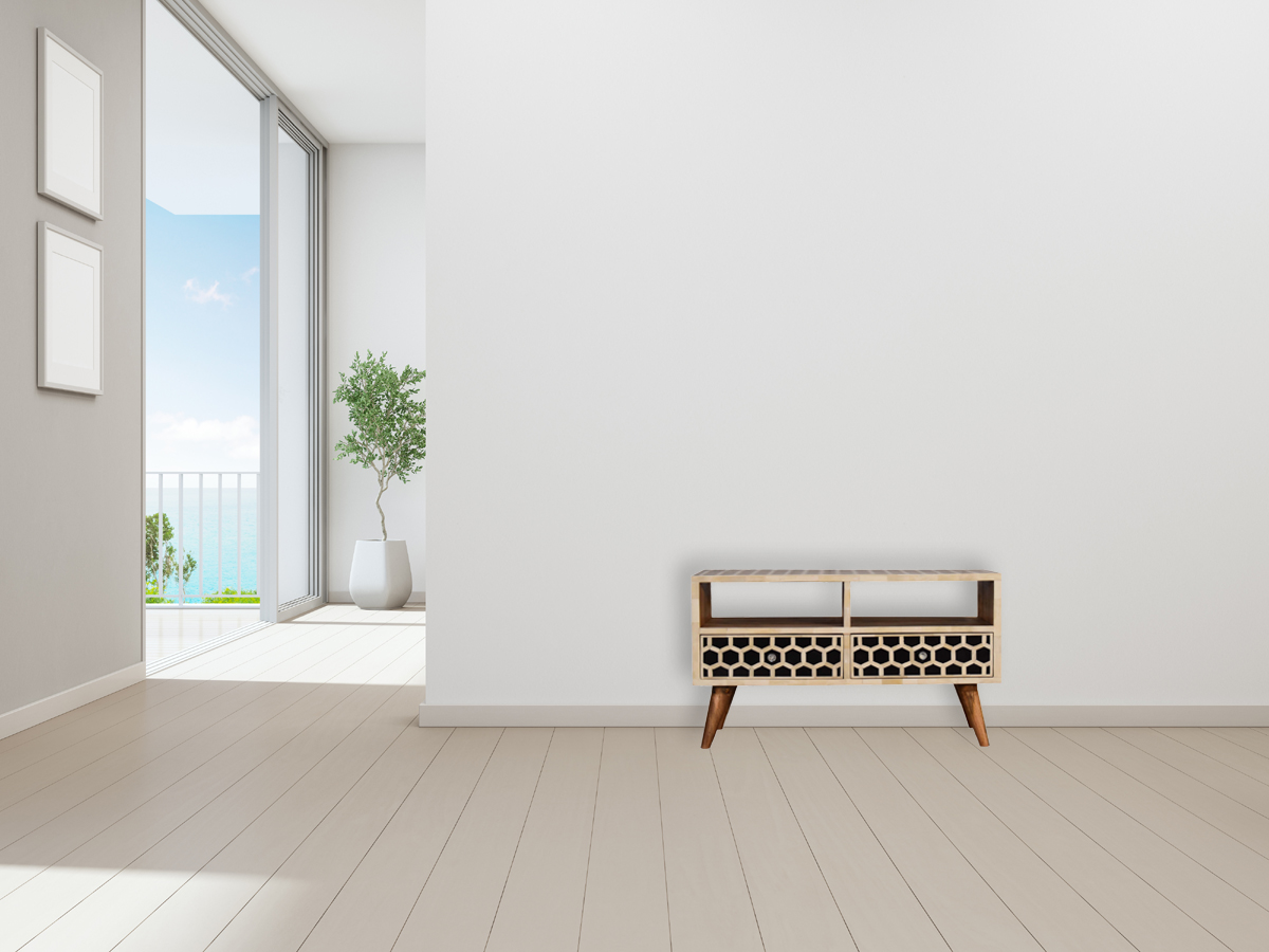 This media unit has a clean and simple design to suit most homes. This piece has a lovely oak-ish finish and features 2 bone inlay drawer fronts which have a honeycomb pattern and 2 glass knobs. It provides 2 open slots and 2 drawers for extra storage. Some other features 4 Scandinavian style legs.