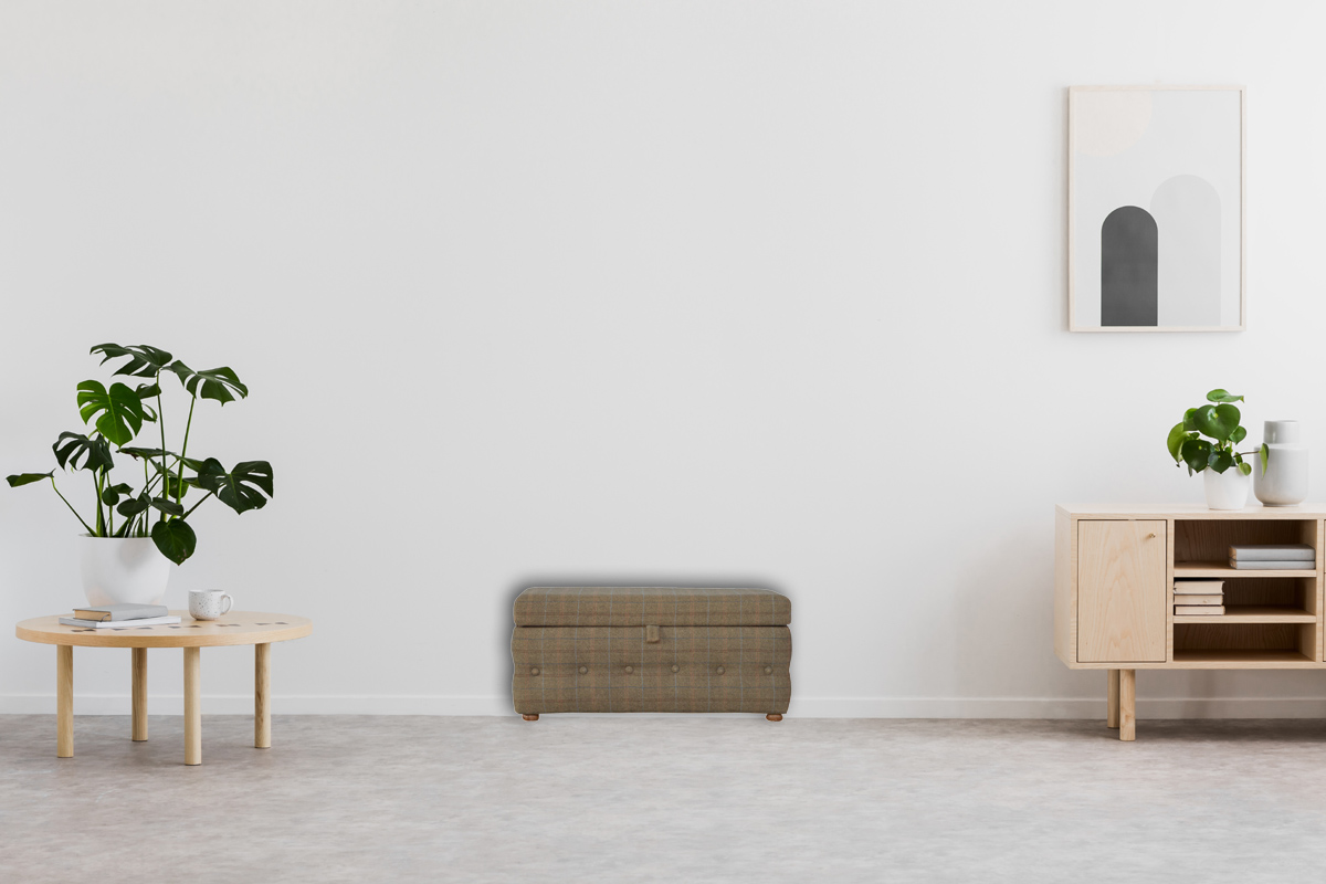 The natural bleached finish on the four bun feet provides a subtle contrast to the tweed, adding an element of sophistication. These feet not only contribute to the piece’s stability but also impart a touch of traditional charm, making it suitable for various decor styles – modern, rustic, or eclectic.