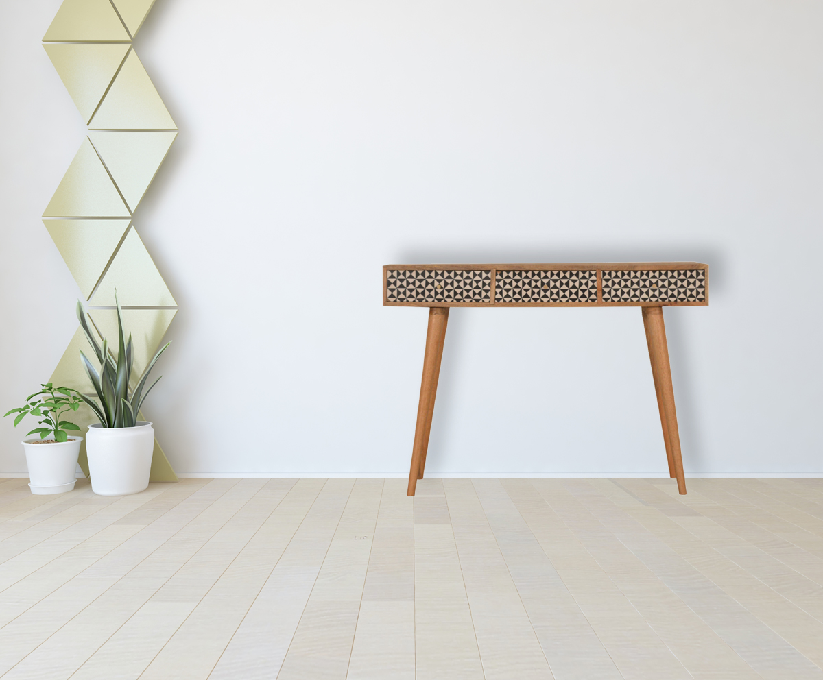 Three smoothly operating drawers provide ample storage, each adorned with shiny brass knobs that create an appealing visual contrast against the wood’s organic hues. These metallic accents catch the light and add a touch of opulence to the table, underlining its exquisite design. The drawers glide open to reveal a substantial space for tucking away your essentials, keeping your area clutter-free and organized.