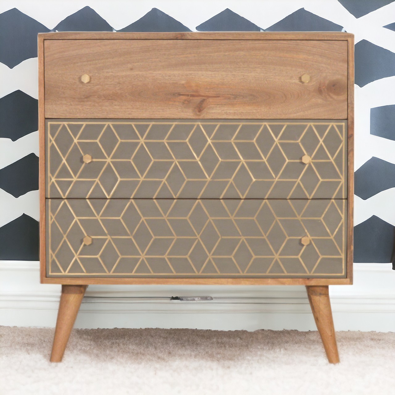 This chest is inspired by a clean, modern design and is constructed from 100% solid mango wood in an oak finish. It features one oak drawer and two gold brass cement dice patterned drawers that beautifully complement the wood’s grain. Other features include Nordic-style legs and shiny knobs.