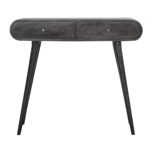 This solid wood console table has been constructed from 100% solid mango wood in a ash black finish and offers a unique shaped design with rounded edges. It features 2 drawers which come with shiny brass knobs and Nordic style legs. A great simple and addition to the home.