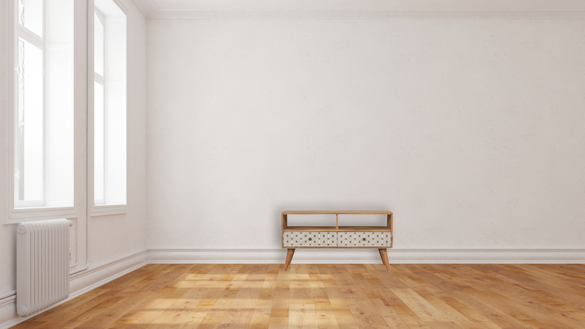 This 2 drawer media unit has been constructed from 100% solid mango wood and finished in a fine oak-ish finish body. The main feature of this piece is the screen-printed drawer fronts which each have a beautiful black and white geometric design. Useful storage is provided with open slots and drawers that can be used to store any CDs, films, or books. It also features 4 Nordic-style legs and shiny knobs.