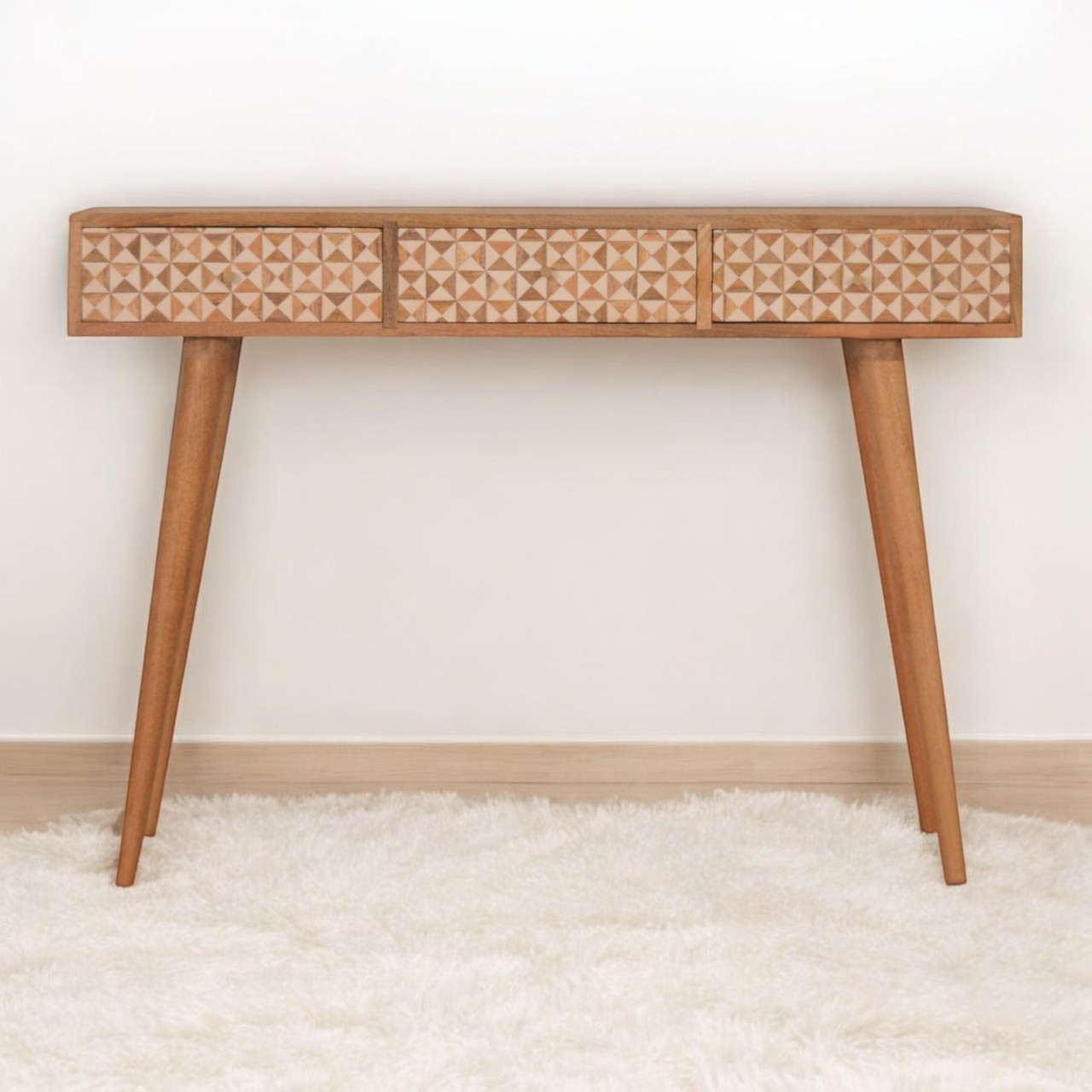At the heart of the Sarina Console Table lies its trio of White Resin Inlay drawers. These drawers, perfectly sized for convenient storage, are adorned with intricate geometric patterns that contrast beautifully with the natural wood grain, creating a visual masterpiece. The shiny knobs further enhance the elegance of the drawers, offering a delightful tactile experience every time you access your stored items. The Nordic-style legs, slender yet robust, provide sturdy support while adding a touch of minimalist charm that complements a variety of interior styles.