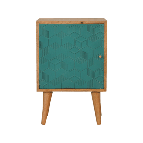 This stunning piece has been constructed from 100% solid mango wood and features nordic style legs. It provides useful storage with the space of 2 drawers and finished with a shiny brass knob. The teal cube design is partnered nicely with the finish of the wood giving an overall modern and chic look.