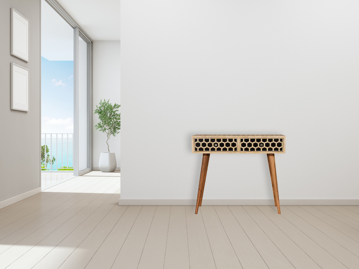 Fashioned with precision, the Honeycomb Bone Inlay Console Table is a commendable addition to any room, with its oak-ish finish radiating a warm, honeyed glow. The dual inlay drawers, replete with a honeycomb design, are not just visually arresting but also capacious, providing ample storage for your needs. A pair of glistening glass knobs adorn each drawer, adding a touch of elegance and ensuring a smooth experience every time you reach inside.