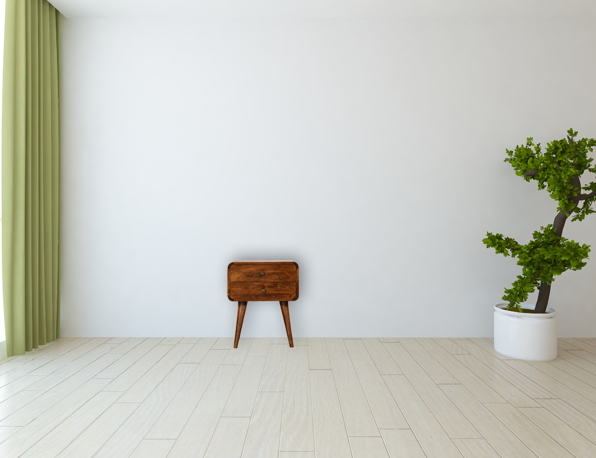 The curved contouring of this bedside table is a true nod to contemporary design—where aesthetics meet ergonomic craftsmanship. The smooth edges not only contribute to an attractive silhouette but also enhance the piece’s compatibility with various living spaces. The sleek design is amplified by two spacious drawers, each adorned with shiny brass knobs that juxtapose beautifully against the chestnut hue. These drawers, with their refined aesthetic and functional capacity, offer ample storage to keep your essentials organized and within arm’s reach.