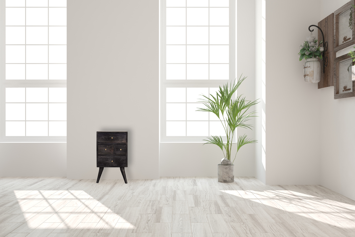 This beautifully designed bedside is constructed from a 100% solid mango wood and has a fine, smooth ash black finish with 4 contrasting drawers and shiny knobs. Featuring Nordic style legs. Endlessly versatile, this bedside table makes a perfect stand for nibbles, drinks or a lamp.