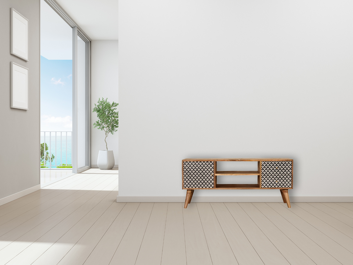 This media unit is not just a piece of furniture; it is a statement of elegance and practicality, offering structured organization alongside a visual feast for the eyes. The fine grain of the mango wood promises durability and longevity, while the beautifully screen-printed doors captivate onlookers with their black and white pattern—one that’s reminiscent of contemporary art and yet, has a timeless appeal that melds seamlessly into various decor schemes.