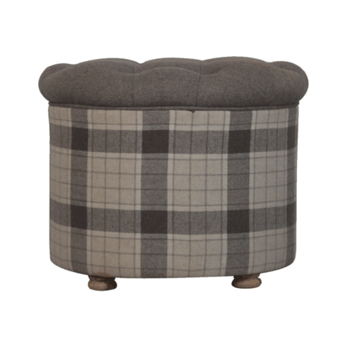 Revitalize your living area with the Deep Button Round Checked Footstool, a distinguished piece that seamlessly blends classic design with modern functionality. This versatile stool, artfully crafted with oak-style feet and upholstered in sleek brown tartan fabric, embodies sophistication and practicality. The brown tweed top, accentuated by a deep button design, adds a luxurious touch, making it an exceptional piece for any setting.