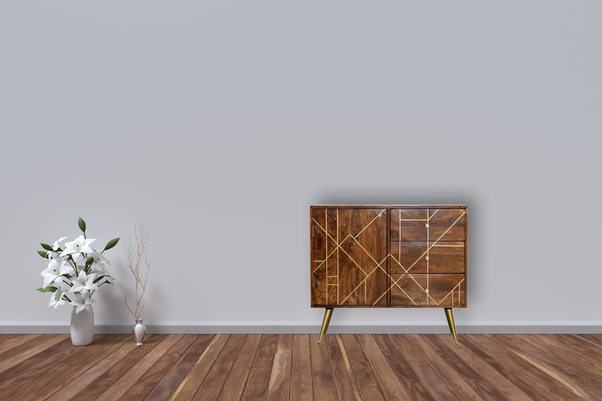 The Chestnut Inlay Abstract Sideboard is more than just a storage solution; it is a piece of art that brings style, sophistication, and functionality to any room. Crafted from 100% solid mango wood and finished with an exquisite chestnut polish, it combines traditional craftsmanship with modern design elements. The gold abstract inlay pattern is a captivating addition that enhances its aesthetic appeal, while the Nordic-style brass legs add a contemporary touch.