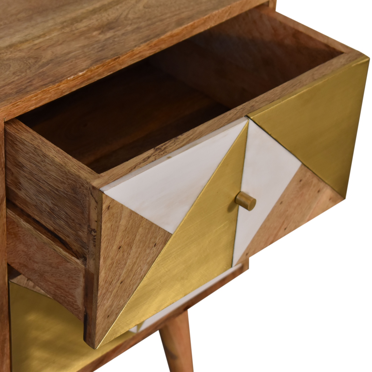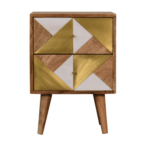 The Ivy Bedside Cabinet stands as a testament to impeccable craftsmanship and refined taste. Its oak-ish finish radiates warmth and natural beauty, enhanced by the clear lacquer, which adds to its aesthetic appeal and durability. The blend of materials—mango wood, brass sheet, and acrylic (faux) marble—on the two drawers creates a striking geometric pattern, making this piece a focal point in any room. The shiny brass knobs provide a touch of sophistication, while the Nordic-style legs offer a modern, minimalist look that fits seamlessly into both contemporary and traditional settings.
