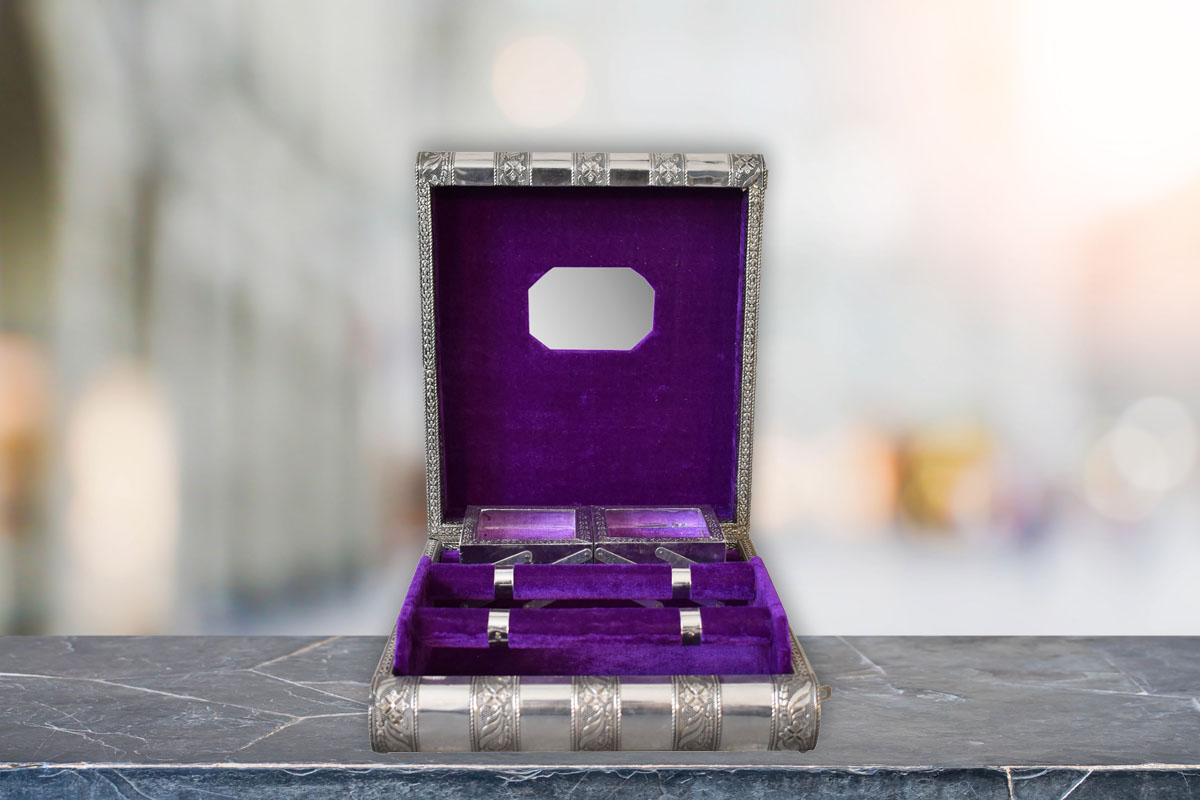 This jewelry box is smart, chic, fashionable, and perfectly designed for your convenience. This box has a fully-lined, violet cotton velvet interior, with little compartments to store all your favourite pieces, as well as 2 ring, or bangle rolls and a small mirror on the lid. The ideal piece for your chest, dressing table or as a gift for friends and family.