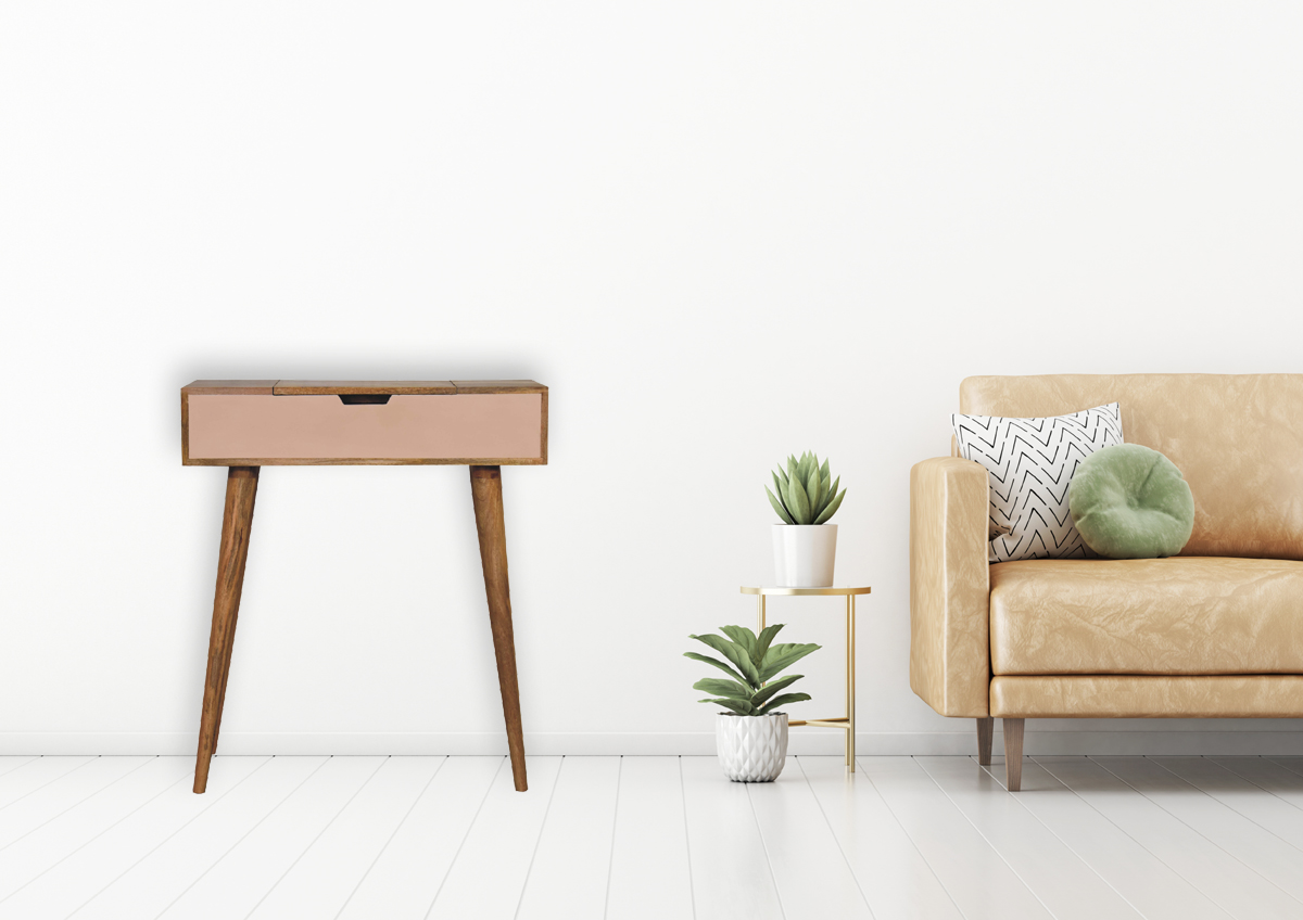 Add this beautiful dressing table to your home. Constructed from 100% solid mango wood in an Oak ish finish with 1 blush pink drawer, it features a foldable mirror and storage compartments for storing any bits and pieces. Other product features – include Nordic-style legs and a cutout slot for easy access into the drawer. A lovely versatile piece that will complement any room beautifully. This petite product is part of Recession Collection.