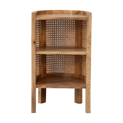 Each Larissa Open Mini Bedside is meticulously crafted from 100% solid mango wood, known for its durability and the beautiful grain pattern it naturally boasts. The oak-ish finish applied to this wood not only highlights its alluring grain but also adds a warm hue that radiates calmness throughout the room. Its design exudes a serene ambiance, with straight delicate legs that provide an understated foundation for the stunning rattan weave pattern that is the focal point of this sideboard.