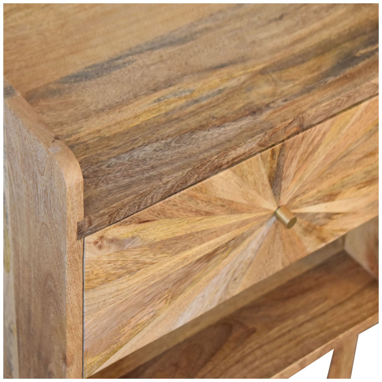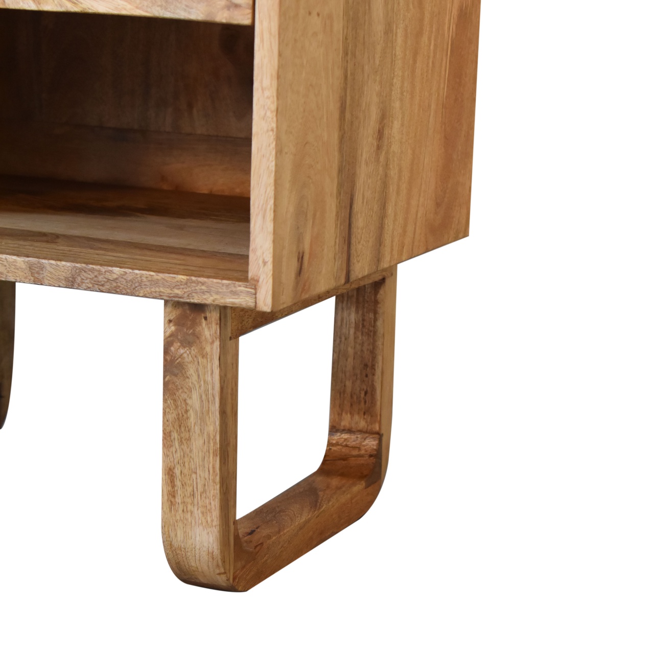 Crafted with unparalleled attention to detail, the U-Shape Sunrise Open Slot Bedside is constructed from 100% solid mango wood, a material that stands the test of time both in durability and style. The fine oak-ish finish radiates warmth and tranquility, contributing to a restful and inviting ambiance in any bedroom. The natural grain of the mango wood peeks through the finish, providing each piece with its own distinctive character—ensuring that your bedside is as unique as your own dawn.