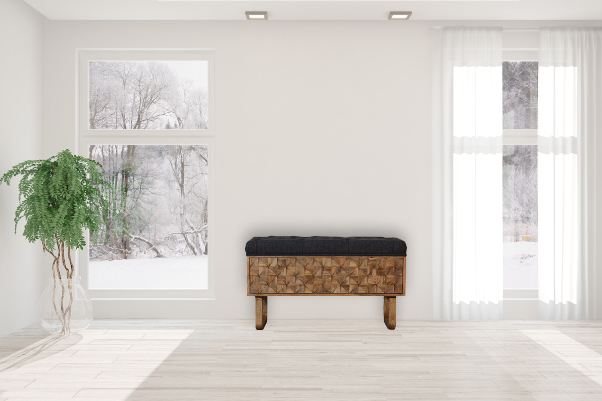 The hand-carved door front is the characteristic that distinguishes the pieces in this collection. This piece has an upholstered grey tweed top and is constructed from 100% solid mango wood with an oak-ish finish. Its style is versatile and can fit into a variety of homes, so it may be paired with other items from the collection or used alone.