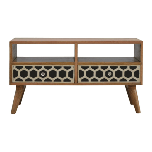 Constructed from 100% solid mango wood, this media unit boasts a delightful oak-ish finish that radiates warmth and coziness throughout your room. The smooth surface features two drawers, ingrained with bone inlay patterns—a mesmerizing mosaic of symmetry that captivates the gaze. Each drawer is accented with delicate glass knobs, adding a touch of opulence to this rustic chic design.