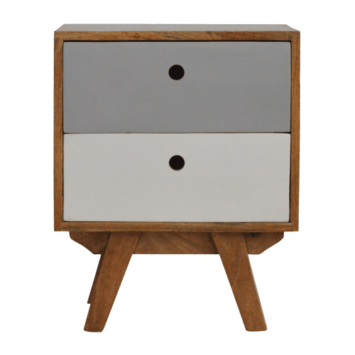Discover the charm of minimalist design and bespoke artisanship with the Two-Tone Hand Painted Bedside Table—a serene addition to any bedroom sanctuary. Meticulously constructed from 100% solid mango wood, this exquisite bedside table is finished with an oak-ish touch, infusing it with a natural allure and robust durability. Each of the two drawers is delicately hand-painted in soothing grey tones, featuring cut-out slots for easy access. This table is an embodiment of versatility and timeless style, designed to complement modern urban dwellings and cozy apartments alike.