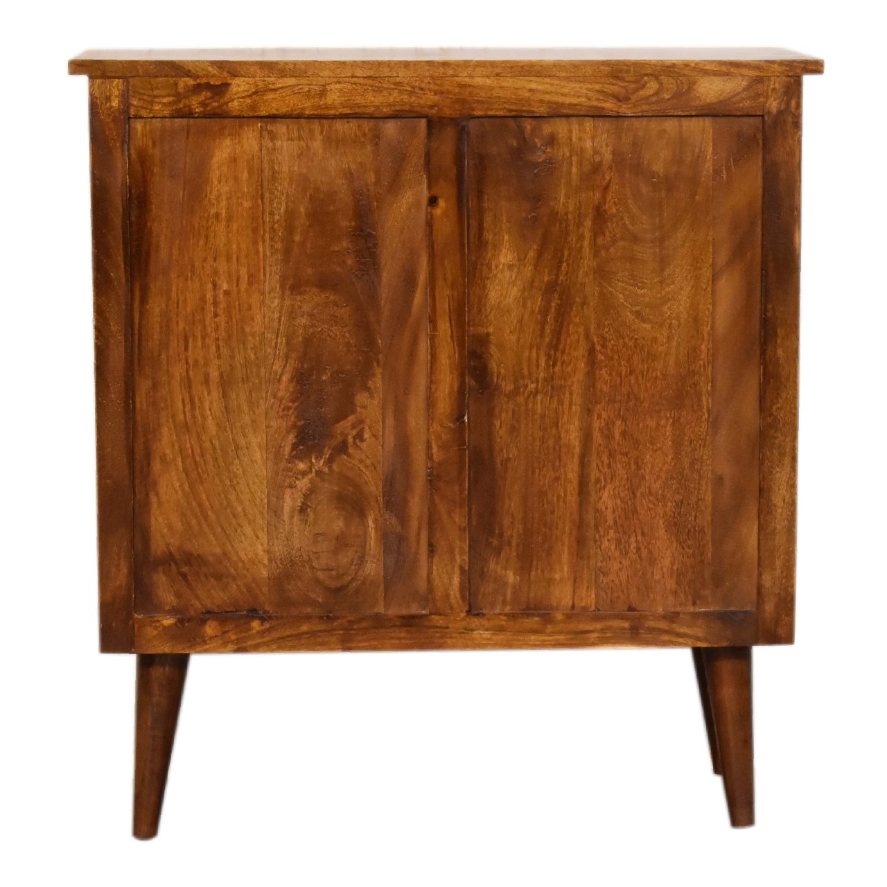 The fine chestnut finish not only enhances the cabinet’s durability but also highlights the natural beauty of the mango wood, showcasing unique grain patterns that make each piece distinctive. Shiny knobs complement the rich wood tones, offering a subtle yet striking contrast that elevates the cabinet’s visual appeal.
