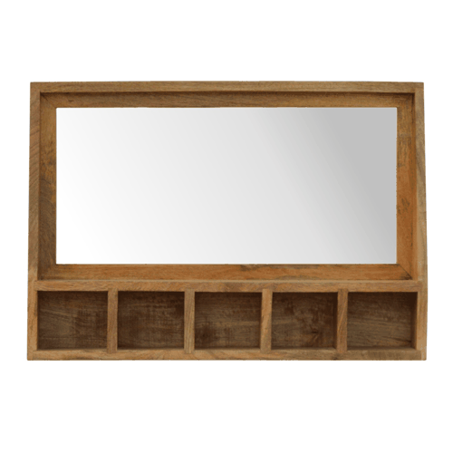 This classic mounted mirror offers excellent storage options with 5 open slots which would be a perfect addition to a traditional country style home. ItÂ’s a versatile piece as it includes 5 mini compartments for storing any small essentials. It has been constructed from 100% solid oak wood in a natural finish, and is a practical piece which has been made to withstand years of use.