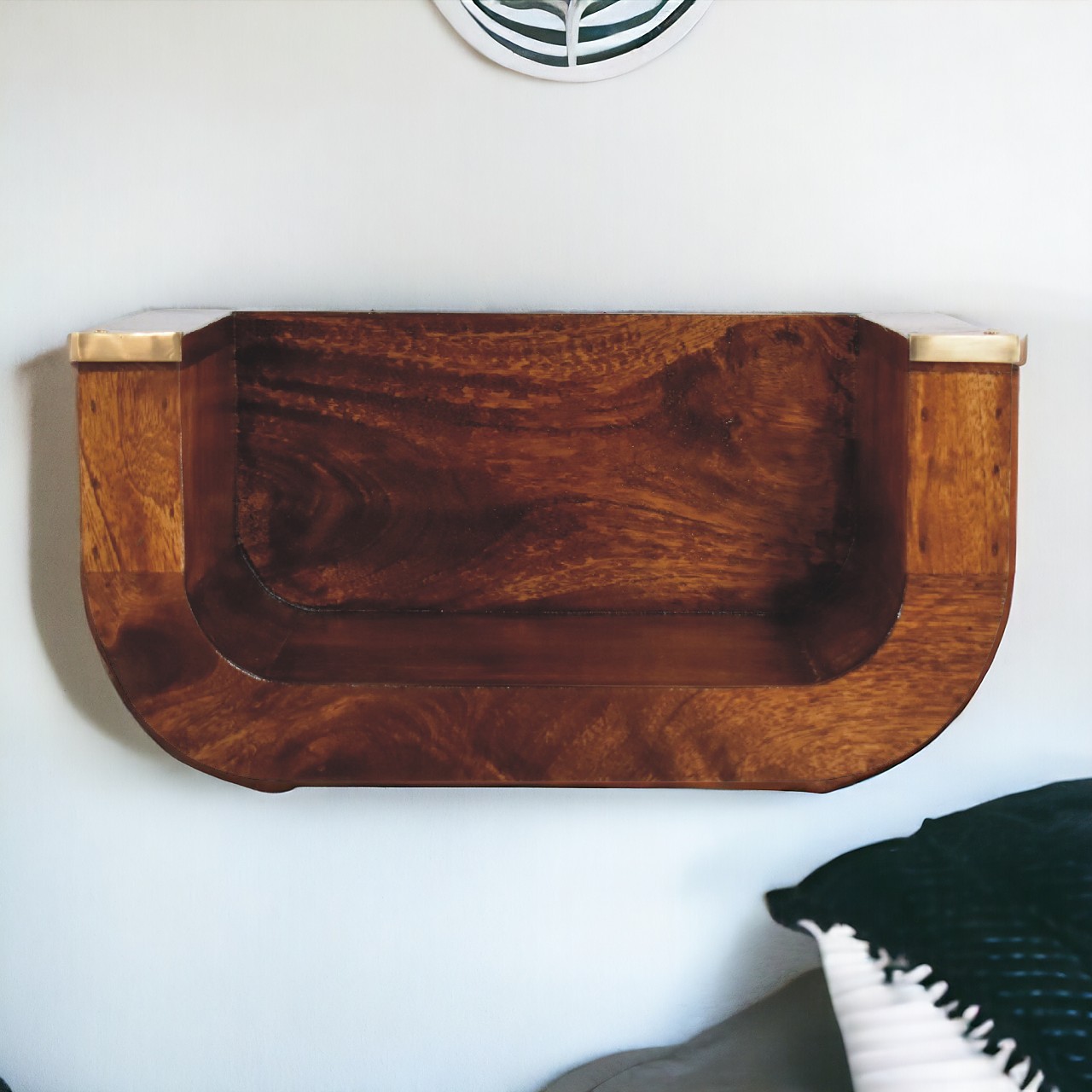 Enhance the aesthetics and functionality of your bedroom with the exquisite Indira Chestnut Floating Bedside. This unique wall-mounted bedside table is designed to provide a chic, space-efficient solution that harmonizes perfectly with contemporary interiors. Meticulously crafted from 100% solid mango wood, it boasts a rich chestnut finish that adds warmth and sophistication to your space.