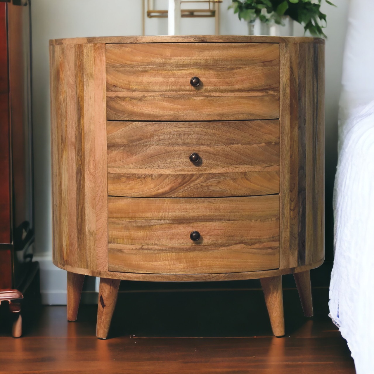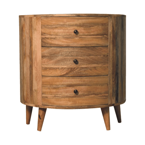 This splendid chest isn’t just another piece of furniture; it’s a journey to a refined home experience. Each curve, etched with precision, and every brass knob, shining with an inviting glow, speaks of a commitment to quality and design. The smooth circular patterns bring out an artistic flair, making it a statement piece that demands attention. With three spacious drawers, the Odyssey Oak-ish Chest offers ample space for your essentials, constituting a perfect blend of form and function.