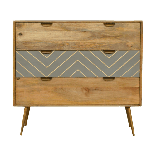 The design of the Sleek Cement Brass Inlay Chest is both functional and striking. It features three spacious drawers, each adorned with a sleek, geometrically patterned brass inlay that brings a touch of luxury. The handles are seamlessly integrated, maintaining the minimalist and clean look of the piece. The drawers provide ample storage space, making this chest as practical as it is beautiful, whether used in the bedroom, living room, or even in a hallway.